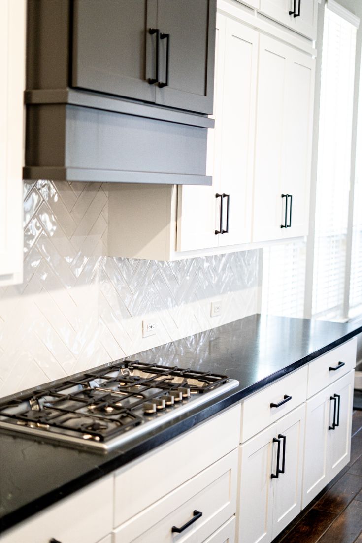 - Install 3x12 subway tile backsplash in herringbone pattern